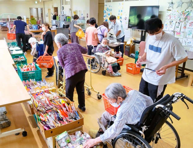 スーパーは大賑わい。30名ほどの利用者様が参加され、皆、いきいきとした表情で、